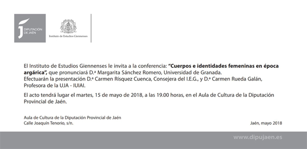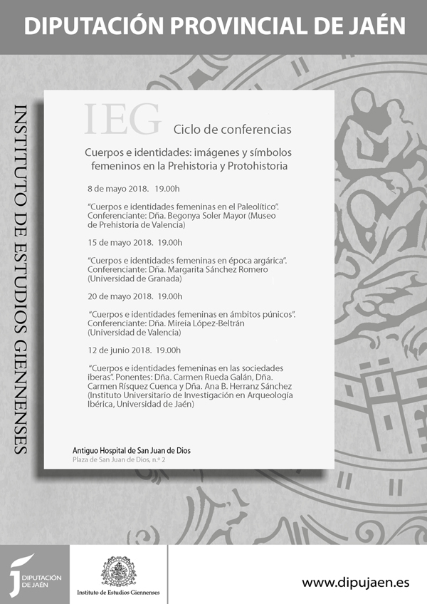 Conferencia “Cuerpos e identidades femeninas en época argárica” dentro del ciclo Cuerpos e identidades: imágenes y símbolos femeninos en la Prehistoria y la Protohistoria” organizado por el Instituto de Estudios Giennenses en el Aula de Cultura de la Diputación de Jaén y dirigido por Carmen Risquez y Carmen Rueda del Instituto de investigación en Arqueología Ibera de la Universidad de Jaén